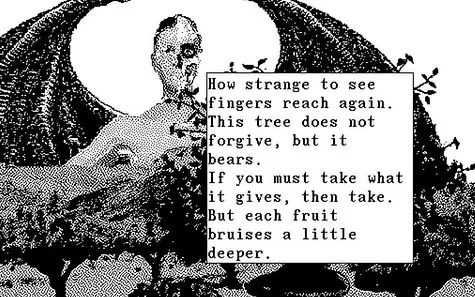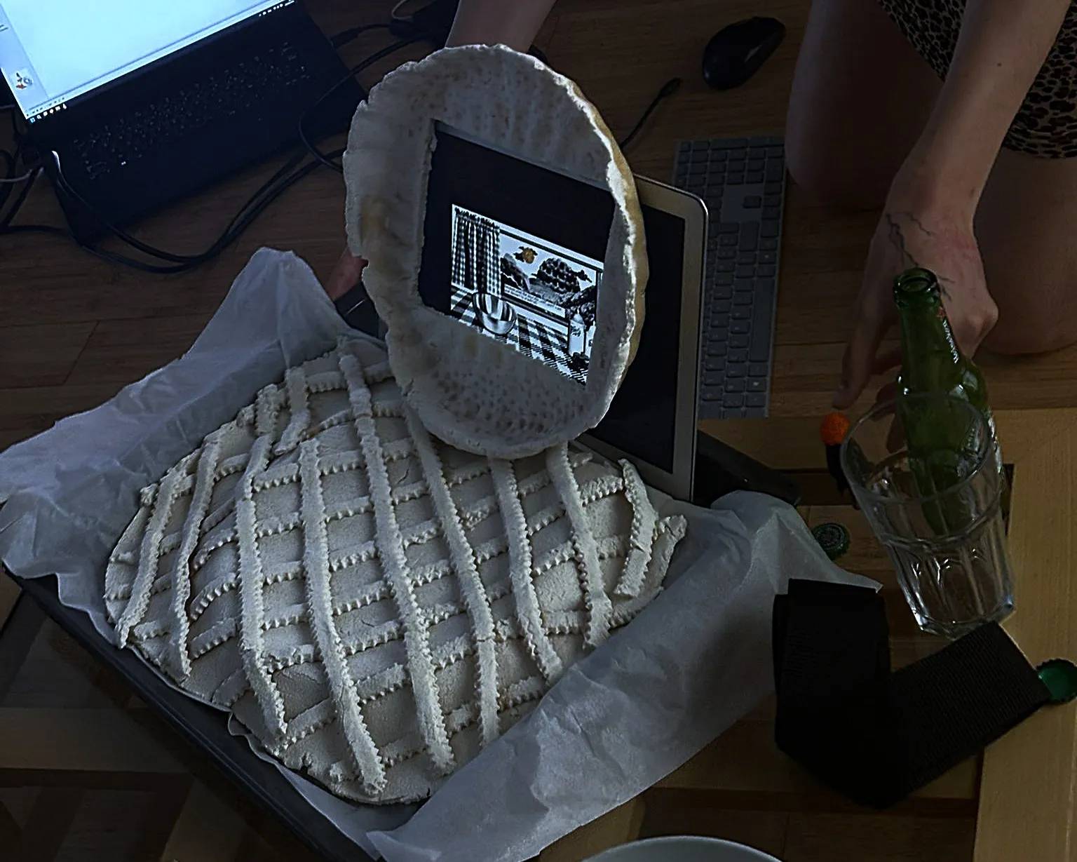 Made in Decker and taking the shape of a cooking point-and-click game, it turns the simple act of baking into a survival ritual, unfolding amid technological glitches, allegorical voices, and ruined landscapes left behind by previous generations. Actions such as picking fruit, pouring flour, or filling a crust become gestures of memory, grief, and transmission. At once playful and ominous, the piece probes how stories are told and rituals are carried forward at the threshold of collapse.